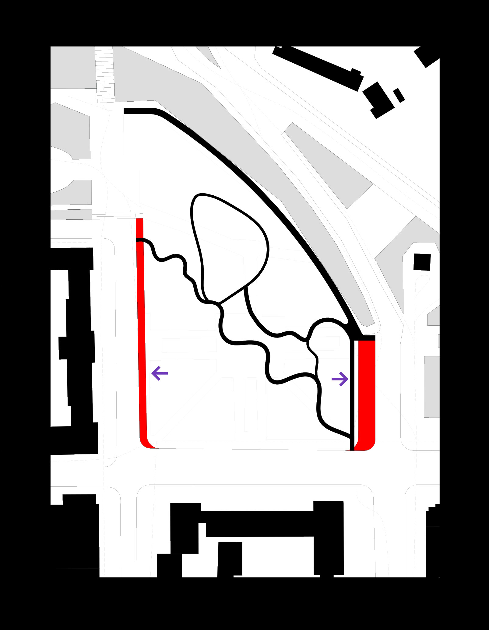 Through a careful analysis of pedestrian flows and existing urban infrastructure, we identified key movement routes that informed the site’s functional zoning. One of the most important axes connects Mykolaiv’s central artery, Soborna Street, to the riverfront—establishing a diagonal pedestrian route that organically shapes the layout. This path, with its soft, bionic curves, is designed to encourage longer, more fluid walking experiences.